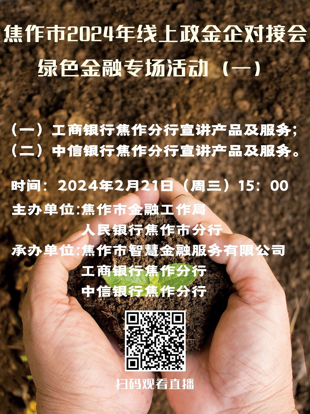 为深入贯彻落实中央金融工作会议精神,做好科技金融、绿色金融、普惠金融、养老金融、数字金融五篇大文章。2月21日下午,在市金融工作局、人民银行焦作市分行的指导下,市智慧金服公司联合工商银行焦作分行、中信银行焦作分行举办了焦作市2024年线上政金企对接会·绿色金融专场首期活动。