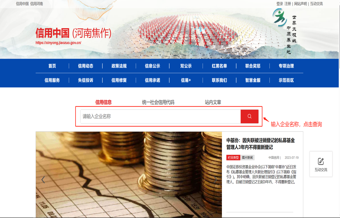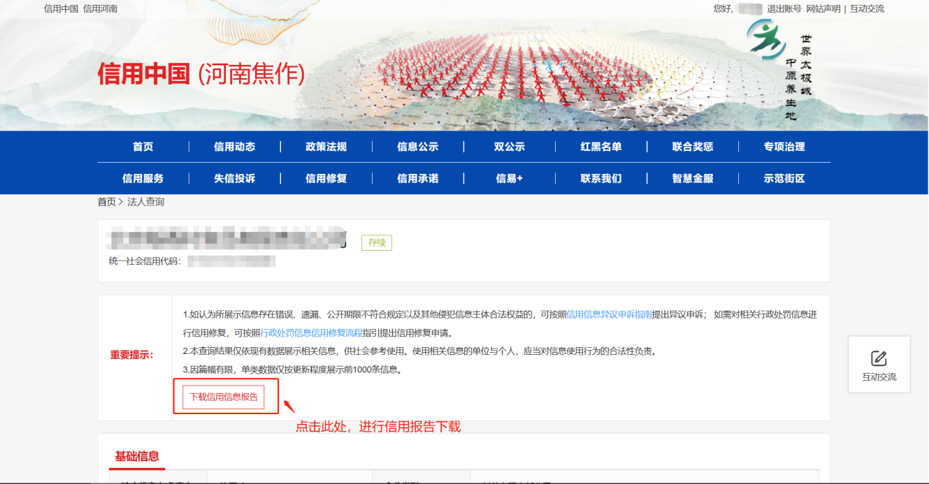 第二步:查询信用报告,登录后点击“首页”,在“信用信息”下,输入企业名称,点击查询,跳转出企业相关信息。